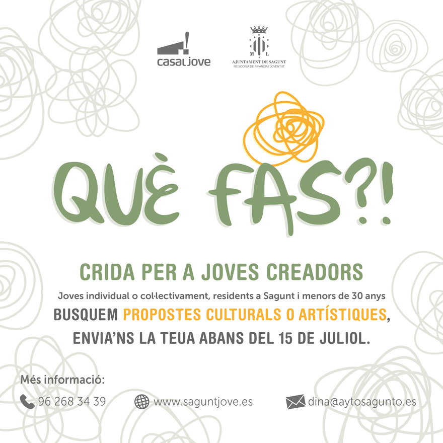 La Concejalía de Juventud e Infancia del Ayuntamiento de Sagunto, consciente de la necesidad de promoción de los/as jóvenes creadores de nuestra localidad, pone en marcha el Censo de Jóvenes Creadores. El objetivo es conocer la realidad de este colectivo juvenil, así como poner en marcha acciones que permitan el mayor desarrollo y promoción de su actividad artística.