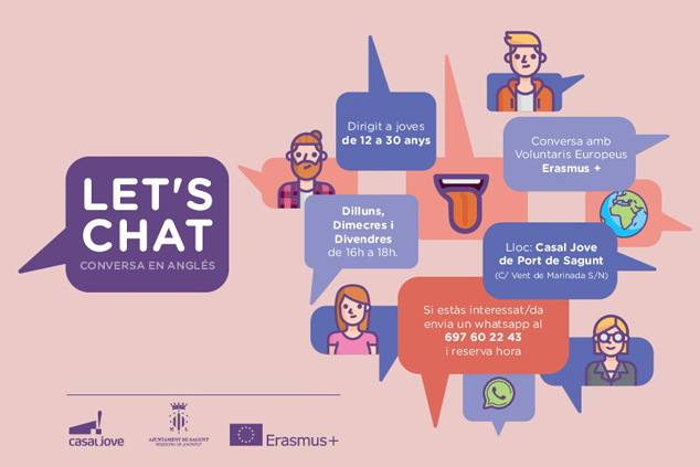 La concejalía de Juventud del Ayuntamiento de Sagunto ofrece clases gratuitas de conversación en inglés en el Casal Jove. La actividad Let’s Chat comenzará a partir de la próxima semana y cuenta con la colaboración de los estudiantes Erasmus Plus de Sagunto.