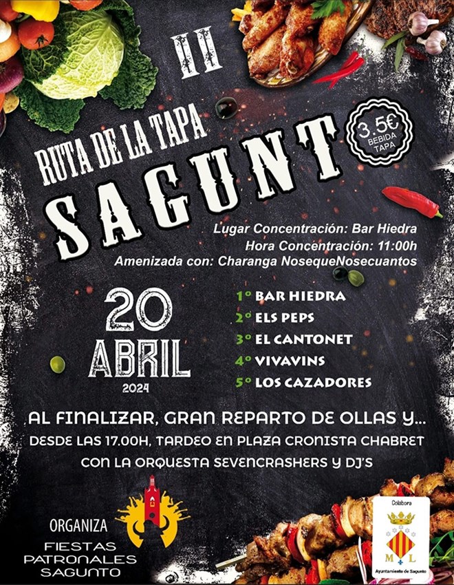 La Associació Cultural Penyes Festes Patronals de Sagunt ha organizado, con la colaboración de la concejalía de Fiestas y Cultura Popular del Ayuntamiento de Sagunto, una serie de actividades para el sábado 20 de abril con motivo del Mig Any de las fiestas. El evento se desarrollará durante el sábado 20 de abril y los actos principales serán en la plaza Cronista Chabret.