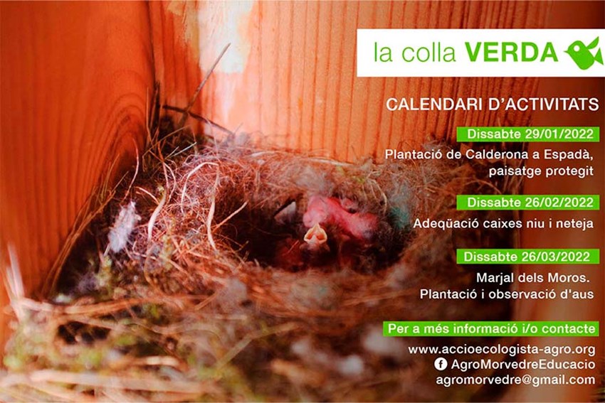 Finalmente, el 26 de marzo, también sábado, la actividad consiste en descubrir la Marjal dels Moros, una zona húmeda de gran valor incluida en la Red Natura 2000 y catalogada como Zona de Especial Protección para las Aves (ZEPA) y Zona Especial de Conservación (ZEC). Con esta acción, con la cual finalizará la campaña de voluntariados invernales de la Colla Verda, se plantará vegetación autóctona y también se descubrirán las aves de esta zona húmeda.