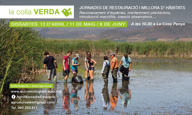 El próximo sábado 11 de mayo, la Comissió d’Educació Ambiental d’Acció Ecologista-Agró organiza un nuevo voluntariado dentro del proyecto la Colla Verda, con el fin de restaurar y mejorar los hábitats de la reserva de fauna silvestre de la Finca de Penya, protegida por Acció Ecologista-Agró. La jornada comenzará a las 10.30 h, siendo el centro medioambiental de La Casa Penya (Marjal d’Almardà-Almenara) el punto de encuentro. Las personas interesadas en participar, deben enviar un correo electrónico a agromorvedre@gmail.com o ponerse en contacto con la organización a través del teléfono 960 263 617.