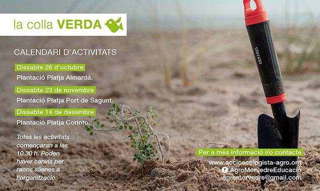 Los tres voluntariados de otoño de la Colla Verda arrancarán a las 10:30 horas (el punto de encuentro lo indicarán en la convocatoria de cada actividad). Para participar en estas plantaciones al lado del mar, que cuentan con la colaboración del Centro para la Investigación y Experimentación Forestal (CIEF) de la Generalitat Valenciana, hay que contactar con la Comisión de Educación Ambiental de AE-Agró vía correo electrónico a agromorvedre@gmail.com o llamando en horario de mañanas al 960 263 617.