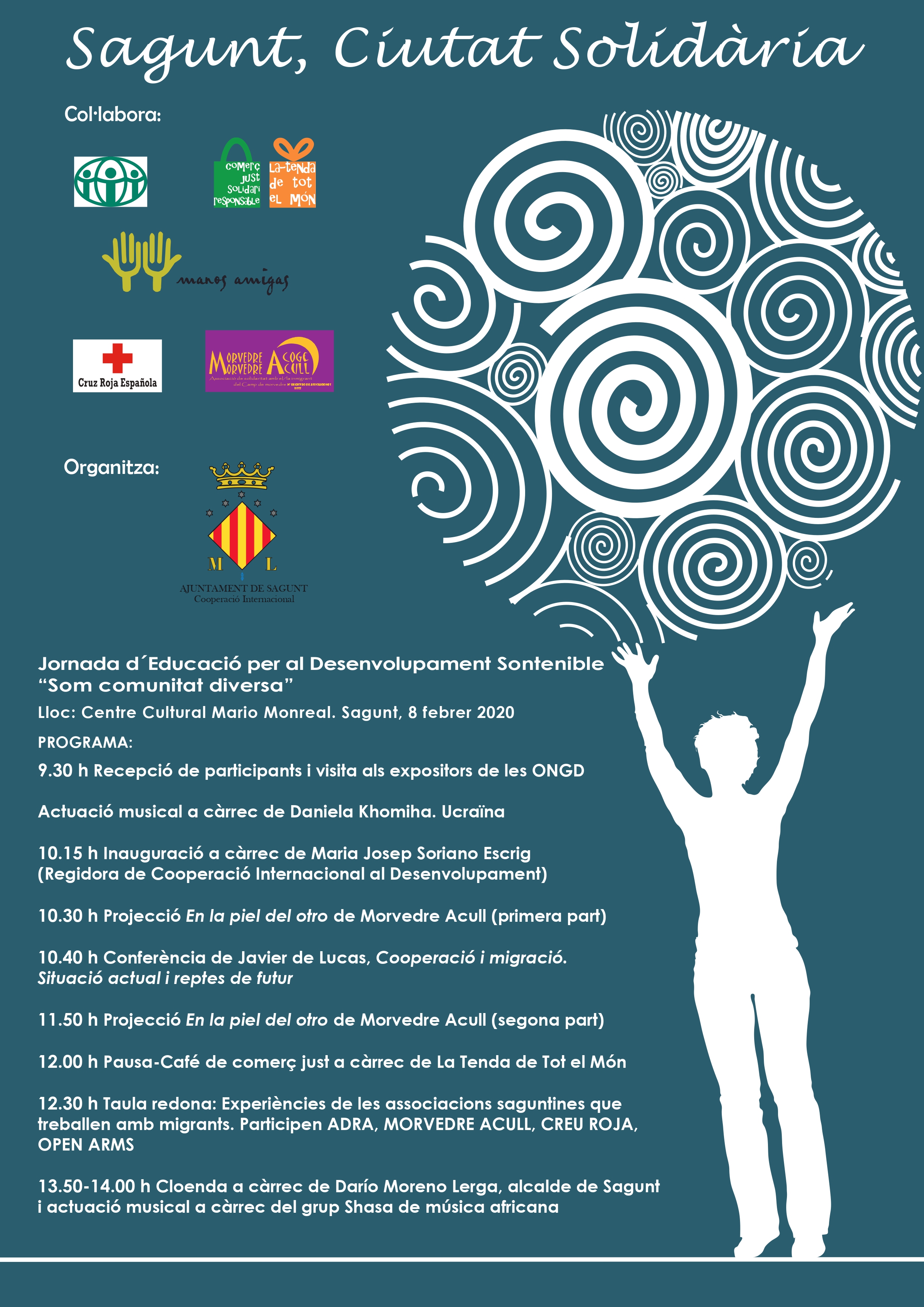 A las 9.30 horas comenzará la jornada con la recepción de participantes y las visitas a los expositores de las ONGD, con la actuación musical a cargo de la ucraniana Daniela Khomiha. A las 10.15 horas, la concejala Maria Josep Soriano será la encargada de inaugurar la jornada. A continuación, se proyectará En la piel del otro, de Morvedre Acoge y tendrá lugar la conferencia de Javier de Lucas ‘Cooperación y migración. Situación actual y retos de futuro’. Tras la pausa tendrá lugar la mesa redonda ‘Experiencias de las asociaciones saguntinas que trabajan con migrantes’, en la que participarán ADRA, Morvedre Acoge, Cruz Roja Camp de Morvedre y Open Arms. Por último, el alcalde de Sagunto, Darío Moreno, clausurará la jornada y el grupo de música africana Shasa ofrecerá una actuación musical.
