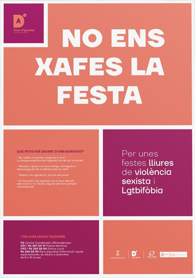 La concejalía de Igualdad del Ayuntamiento de Sagunto presenta la segunda edición de la campaña de prevención de agresiones sexistas y contra la LGTBIfòbia ‘No ens xafes la festa. Per unes festes lliures d’agressions sexistes i LGTBIfòbia’ en la temporada de fiestas del municipio.