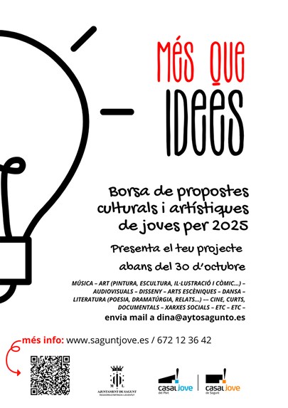 La concejalía de Juventud e Infancia ha abierto una convocatoria para enviar todo tipo de propuestas culturales hasta el próximo 30 de octubre. Si le interesa participar en el proyecto Més que Idees debe rellenar una ficha de inscripción que puede encontrar en el siguiente enlace: https://www.saguntjove.es/wp-content/uploads/2024/09/Ficha-inscripcion-artistes.pdf.