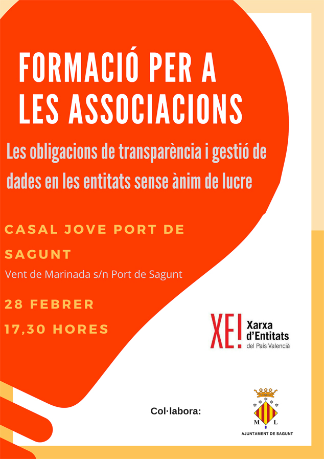 Por otro lado, la sesión formativa ‘Transparencia de las asociaciones y protección de datos en las ENL’ será el jueves 28 de febrero a las 17.30 horas en el Casal Jove de Puerto de Sagunto, y no requiere inscripción previa.