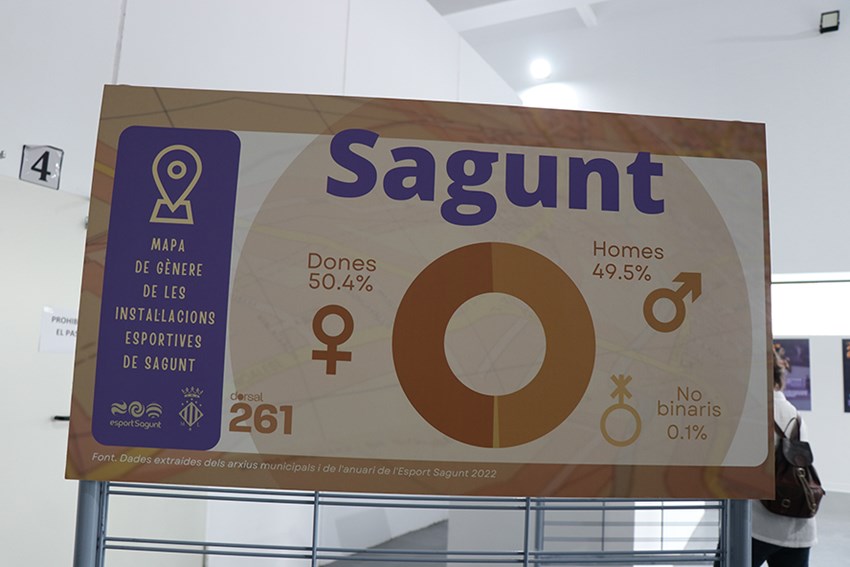 Por otro lado, como segunda acción de este programa se ha expuesto unos mapas de género sobre instalaciones deportivas de la ciudad de Sagunto. Estos mapas recogen el porcentaje de hombres, mujeres y personas no binarias que están inscritos en las actividades que se realizan en las instalaciones municipales. Esta información se puede ver en un mapa general que muestra la totalidad de los datos de las instalaciones, y en mapas con la información separada por cada uno de los recintos municipales.