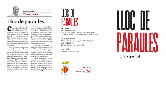 Con esta muestra, el diseñador gráfico Tomás Gorria trata de dar vida a las palabras a la vez que hace un repaso por su carrera profesional. Para ello, utiliza el humor, juega con los vocablos, las grafías, los logos, las tipografías y la imaginaria popular. Tal y como él explica, el título ‘Lloc de paraules’ viene de «lloc en tanto lugar y en tanto sonido que remite al joc del juego». Gorria utiliza su ingenio para retorcer las palabras y extraer su jugo, dando como resultado su propio significado peculiar y creativo de las palabras.