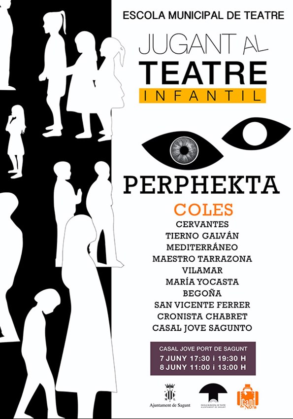 El alumnado más pequeño tendrá su cita teatral en el Casal Jove de Puerto de Sagunto con la propuesta de juego dramático Perphekta, donde tanto niños y niñas como familias, intervendrán divirtiéndose con canciones y música original de Ismael Bereje, director del equipo pedagógico formado por Sandra Godos, Olga Tarrazón, Noelia Luján, Inés Subirón y con la aportación especial este curso de Mari Carmen Carrera. Este evento cultural está programado para el 7 de junio, tanto a las 17como a las 19:30 horas, así como el 8 de junio a las 11 y a las 13 horas.
