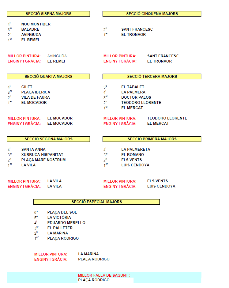 El jurado ha otorgado a la falla Plaça Rodrigo el primer premio en la Sección Especial, además del de Ingenio y Gracia. El segundo premio en la categoría grande ha sido para La Marina, que también ha obtenido el premio de Mejor Pintura, mientras que El Palleter ha quedado en tercer lugar. El cuarto, quinto y sexto premio han sido para las fallas Eduardo Merello, La Victoria y Plaza del Sol respectivamente.