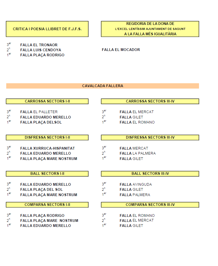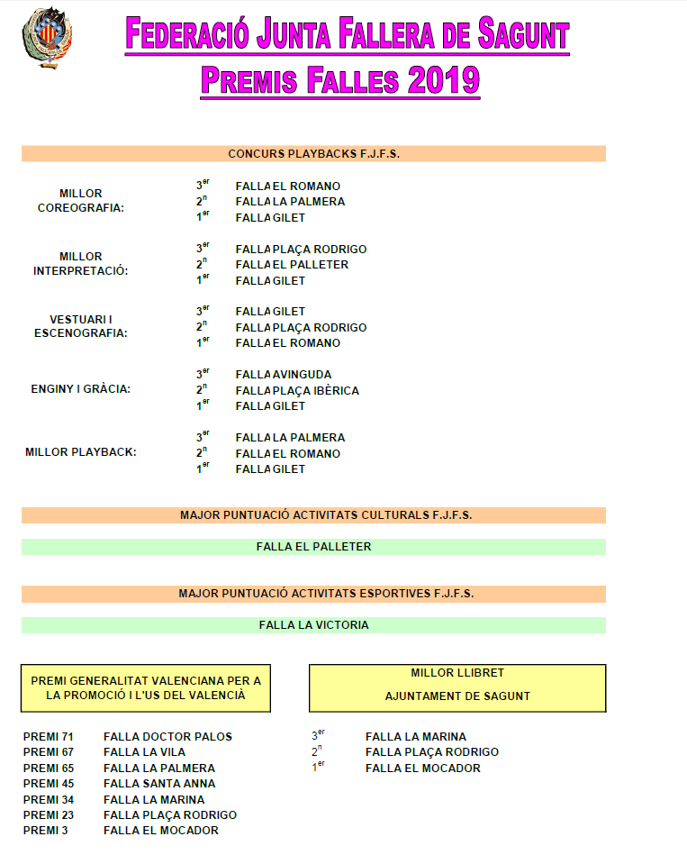 Finalmente, la falla El Mocador se hizo con el premio al mejor llibret, otorgado por el Ayuntamiento de Sagunto. Las fallas Plaça Rodrigo y La Marina son segunda y tercera en esta categoría. También cabe destacar que la Falla El Mocador ha recibido el tercer premio de la Generalitat Valenciana en la promoción y uso del valenciano.