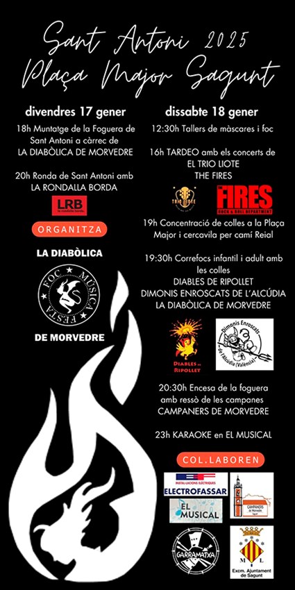 La asociación La Diabòlica de Morvedre celebrará una serie de actividades como hogueras, espectáculos musicales y eventos infantiles en la plaza Mayor de Sagunto. Esta iniciativa se llevará a cabo por la festividad de Sant Antoni y con la colaboración del Ayuntamiento de Sagunto.