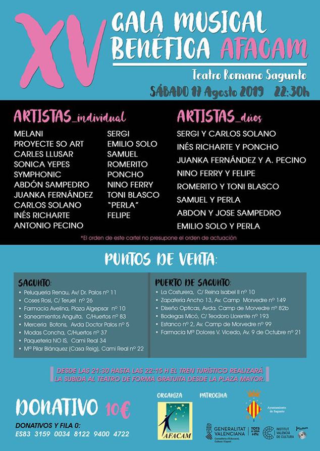 El sábado 17 de agosto, la Asociación de Familiares de Personas con Enfermedad de Alzheimer y otras demencias del Camp de Morvedre y Puçol (AFACAM) llevará a cabo la decimoquinta edición de la tradicional Gala Musical Benéfica, que comenzará a partir de las 22.30 horas en el Teatro Romano de Sagunto. Esta gala se encuentra dentro de la programación del festival Sagunt a Escena y toda la recaudación irá destinada al mantenimiento de la asociación, para atender a personas con Alzheimer y otras demencias y a sus familias.