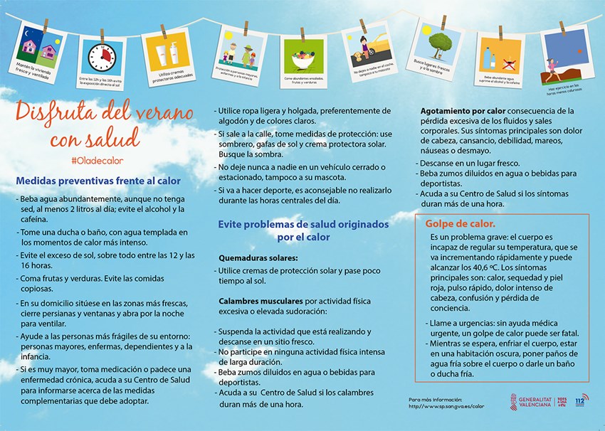 La Generalitat Valenciana ha lanzado, un año más, con la mirada puesta en el presente verano 2022, el Programa de Prevención y Atención a los Problemas de Salud Derivados de las Temperaturas Extremas en la Comunitat Valenciana, que se extenderá durante toda la temporada estival.
