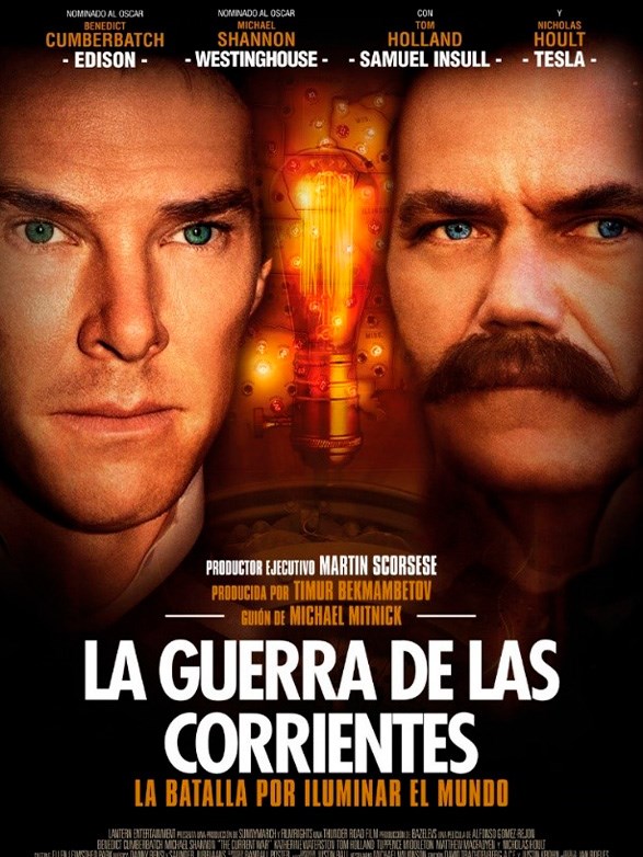 Este film tiene una duración de 103 minutos y se estrenó en 2017. A finales del siglo XIX dos genios, Thomas Edison (Benedict Cumberbatch) y George Westinghouse (Michael Shannon), este último junto a Nikolai Tesla (Nicholas Hoult), compiten para crear un sistema sustentable de electricidad y poder comercializarlo a todos los Estados Unidos en lo que se conoce como la “guerra de las corrientes”, una rivalidad entre los dos en la década de 1880 por el control del incipiente mercado de la generación y distribución de energía eléctrica. El productor ejecutivo de esta película es Martin Scorsese.