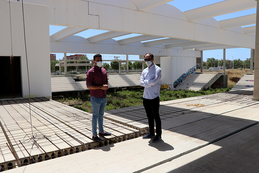 El alcalde de Sagunto, Darío Moreno, (izquierda) y el concejal de Contratación y de Deportes, Javier Raro (derecha) en la última visita al pabellón en julio de 2020