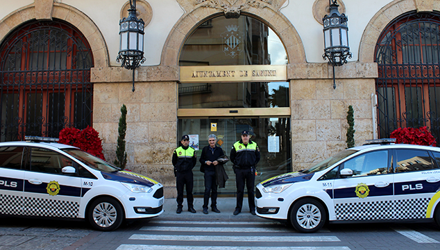 Hoy entran en funcionamiento dos nuevos vehículos Ford Cmax que se incorporan a la actual flota de vehículos de la Policía Local de Sagunto. Los dos automóviles son automáticos y están dotados con la última tecnología en iluminación led y en comunicaciones. El concejal de Policía Local, Enric Ariño, y agentes de la central de Policía Local de Sagunto han presentado los vehículos esta mañana en las puertas del Ayuntamiento.