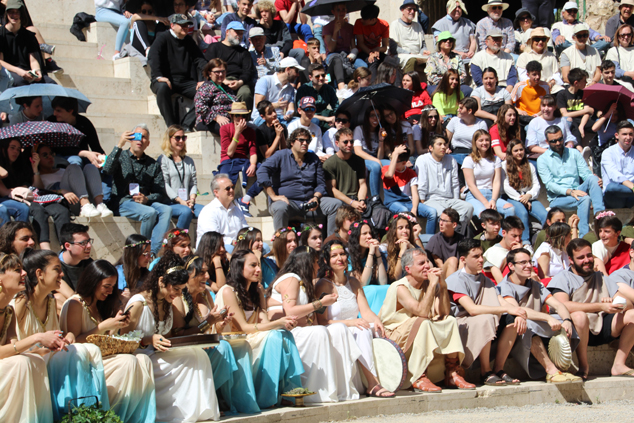 La pompa ha llegado al teatro al son de los instrumentos y, en primer lugar, han entrado los narratores que han dado la bienvenida a los espectadores y han explicado las acciones que se van a desarrollar. El magistrado y su esposa, tras un breve discurso de bienvenida, han esperado sentados para participar de las ofrendas a Pales.