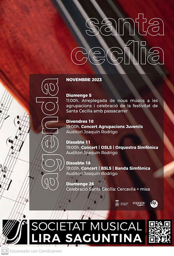Además, la Banda Sinfónica Lira Saguntina interpretará el tradicional concierto de Santa Cecilia con obras de gran trascendencia dentro del repertorio bandístico y que hacen mención a la trayectoria histórica de este conjunto musical. La actuación está programada para el sábado 18 de noviembre a las 19 horas en el auditorio en la que interpretará todas las obras dirigidas por Daniel Olmos Herrero.