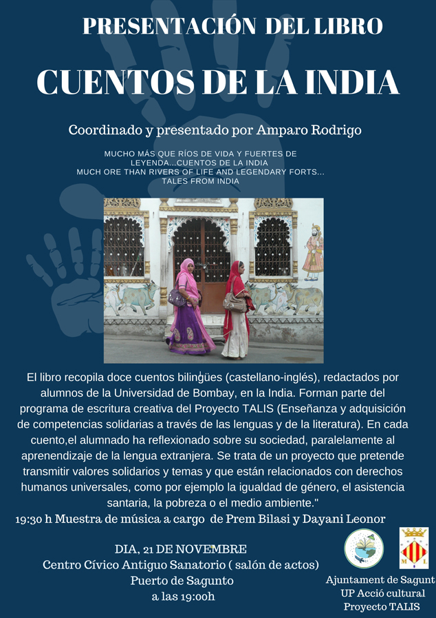 La delegación de la Universidad Popular presenta el libro ‘Cuentos de la India’ de la Asociación TALIS. La asociación que trabaja de la mano de la concejalía, para la enseñanza y adquisición de competencias solidarias e interculturales a través de las lenguas y la literatura, este próximo martes 21 de noviembre, a las 19.00, presentará el acto en el salón de actos del Centro Cívico Antiguo Sanatorio de Puerto de Sagunto.