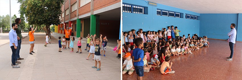 El lunes, el primer edil y el responsable del departamento de Juventud e Infancia visitaron las cinco sedes del Campamento Urbano Corresponsables, que este año tiene como hilo conductor el cambio climático con el objetivo de sensibilizar y educar a padres, madres, niños y niñas en relación al cuidado del medio ambiente. Se trata de un proyecto experimental cuyo objetivo primordial es la conciliación familiar y por el que han pasado 650 menores del municipio de entre 4 y 12 años, a quienes ha atendido un equipo de más de un centenar de profesionales. Así, se acudió a los colegios Cervantes, Begoña y Vilamar, en Puerto de Sagunto, y Cronista Chabret y Ausiàs March de Sagunto.