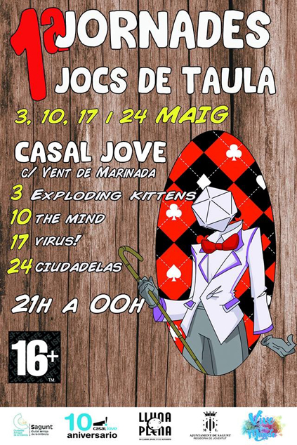 Por su parte, el programa de las 1ª Jornadas de Juegos de Mesa va dirigido a personas mayores de 16 años y se desarrollará en el Casal Jove de Puerto de Sagunto de 21 a 00 horas. El día 3 de mayo será el torneo de Exploding Kittens, el día 10 tendrá lugar el de The Mind, el 17 de mayo el torneo de Virus!, y el 24 de mayo será el de Ciudadelas.