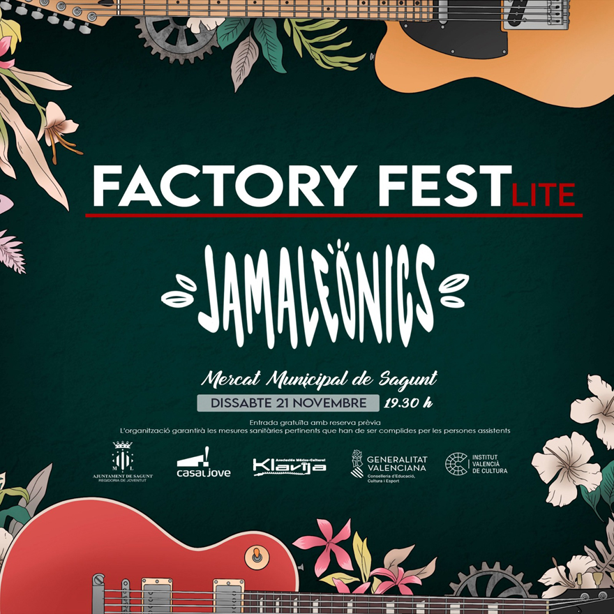 El Factory Fest Lite continúa este sábado, 21 de noviembre, con la actuación del grupo valenciano Jamaleonics. El lugar será la plaza interior del Mercado Municipal de Sagunto a partir de las 19.30 horas y las entradas ya están agotadas.