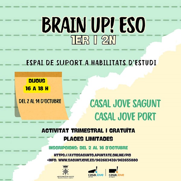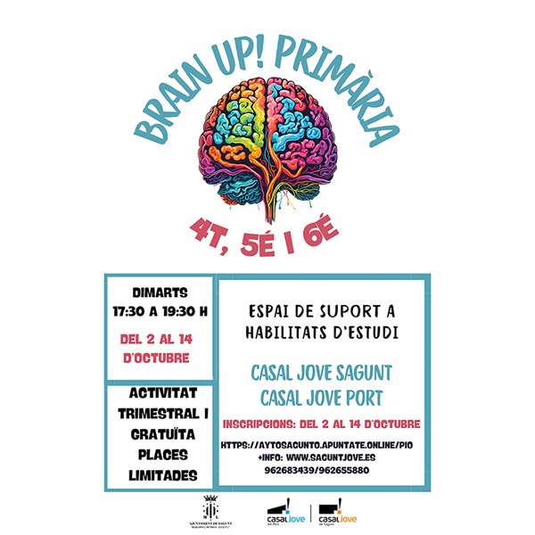 Las plazas son limitadas por lo que el área de Juventud e Infancia ha abierto un proceso de inscripciones que finaliza el lunes, 14 de octubre, para el alumnado de Educación Infantil, y el miércoles, 16 de octubre, para el estudiantado de ESO. Las personas interesadas en participar en ‘Brain UP – Espacio de apoyo a habilidades de estudio’ pueden solicitar su plaza a través del siguiente enlace: https://aytosagunto.apuntate.online/pio/?area=21.