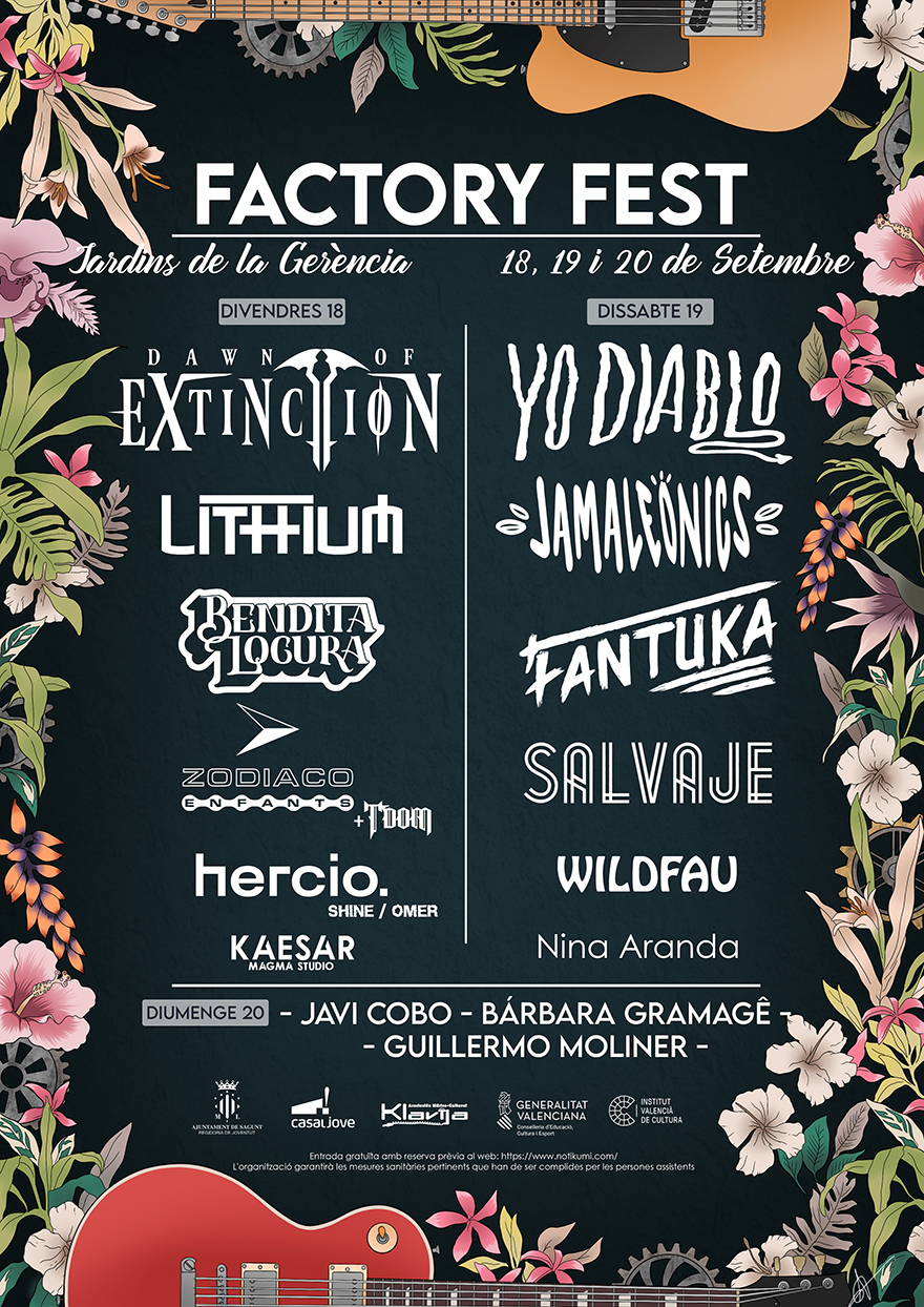 El Factory Fest se desarrollará durante los días 18, 19 y 20 de septiembre, con horario de 18 a 24 horas, en los Jardines de la Gerencia y se centrará en los conciertos de música en los cuales participarán 16 artistas o grupos de la localidad, todos/as ellos/as menores de 30 años. Como complemento a la música en directo, el plato principal de este evento, también habrá una zona de foodtrucks y una zona de terraza con barra. La entrada será gratuita con reserva.