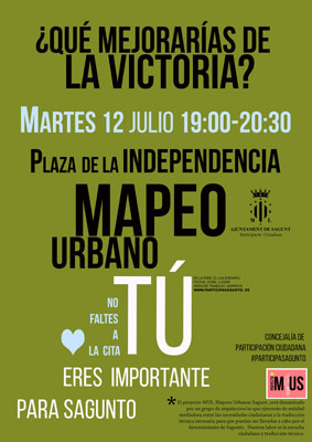 Este martes, 12 de julio, a las 19 horas, el proyecto Mapeos Urbanos Sagunto (MUS), de la delegación de Participación Ciudadana del Ayuntamiento de Sagunto, se traslada a la zona de La Victoria de Puerto de Sagunto, concretamente a la plaza de la Independencia, en torno a la cual está el grupo de viviendas de la conocida como Ciudad Dormida, cerca del Barrio Obrero.