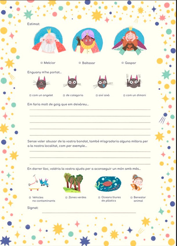 Se trata de una edición de diseño atractivo y actual que, año tras año, es una delicia para los niños y niñas de toda la ciudad. Como en los últimos años, las cartas se distribuirán en las paradas de los mercados de Navidad y en los mercados municipales. La carta incluye en la parte interior dibujos con vocabulario básico en valenciano y un espacio para que los niños y las niñas hagan sus peticiones personales a Melchor, Gaspar y Baltasar, pero también incluye unos apartados más solidarios con buenos deseos y mejoras para la ciudad y para el mundo.