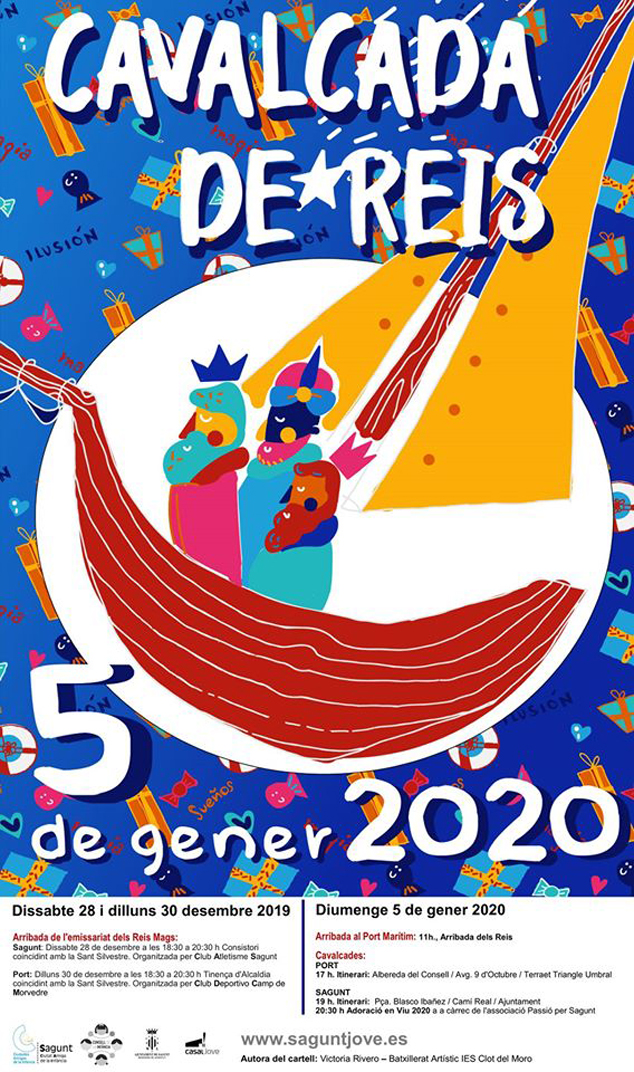 La tradicional Cabalgata de Reyes, cuyo tema este año son los viajes de aventuras alrededor del mundo, empezará a las 17.00 h. Primero transcurrirá por Puerto de Sagunto, con un recorrido que cambia respecto al año pasado, ya que se iniciará en la Alameda y recorrerá la avenida 9 d’Octubre hasta el Triángulo Umbral donde Melchor, Gaspar y Baltasar serán recibidos con una actuación teatral. A partir de las 19 horas, aproximadamente, será el turno de recorrer el núcleo de Sagunto. La cabalgata iniciará su recorrido en la calle Almenara hasta las puertas del consistorio por Camí Reial, y finalizará con la Adoración de los reyes en el belén viviente a cargo de Passió per Sagunt en la plaza Mayor.
