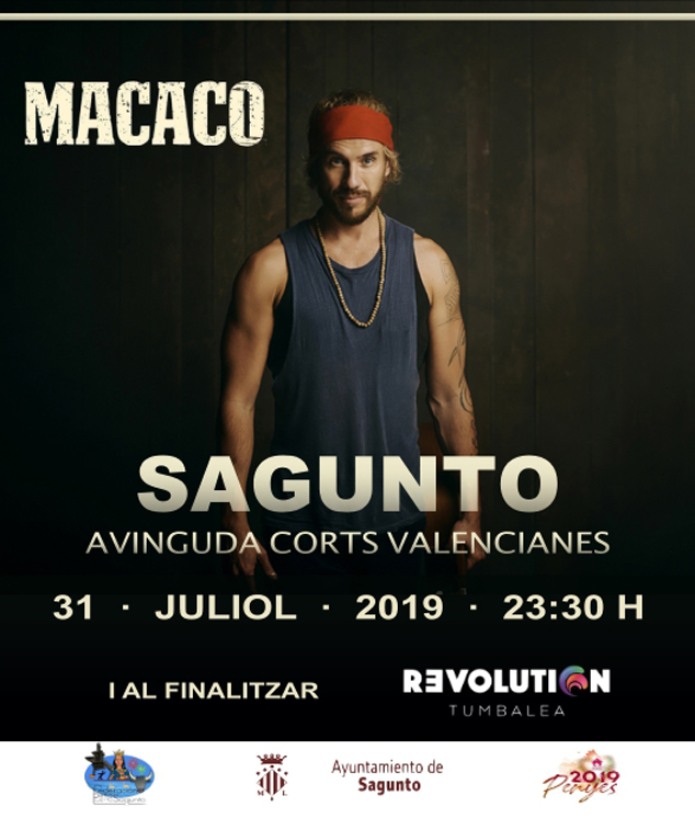 El artista catalán Macaco será el plato fuerte de las fiestas de este año con el concierto que ofrecerá el próximo miércoles, 31 de julio, como colofón de las fiestas de Sagunto y comienzo de las de Puerto de Sagunto. El concierto empezará a las 23.30 horas en la zona internucleos (en la explanada ubicada en la avenida Cortes Valencianas con la calle Carmen Martín Gaite, junto al polígono industrial Sepes). Después de la actuación, la fiesta continuará con la actuación de Revolution Tumbalea hasta las 4 horas de la madrugada. Hay que destacar que las dos actuaciones son de entrada libre.