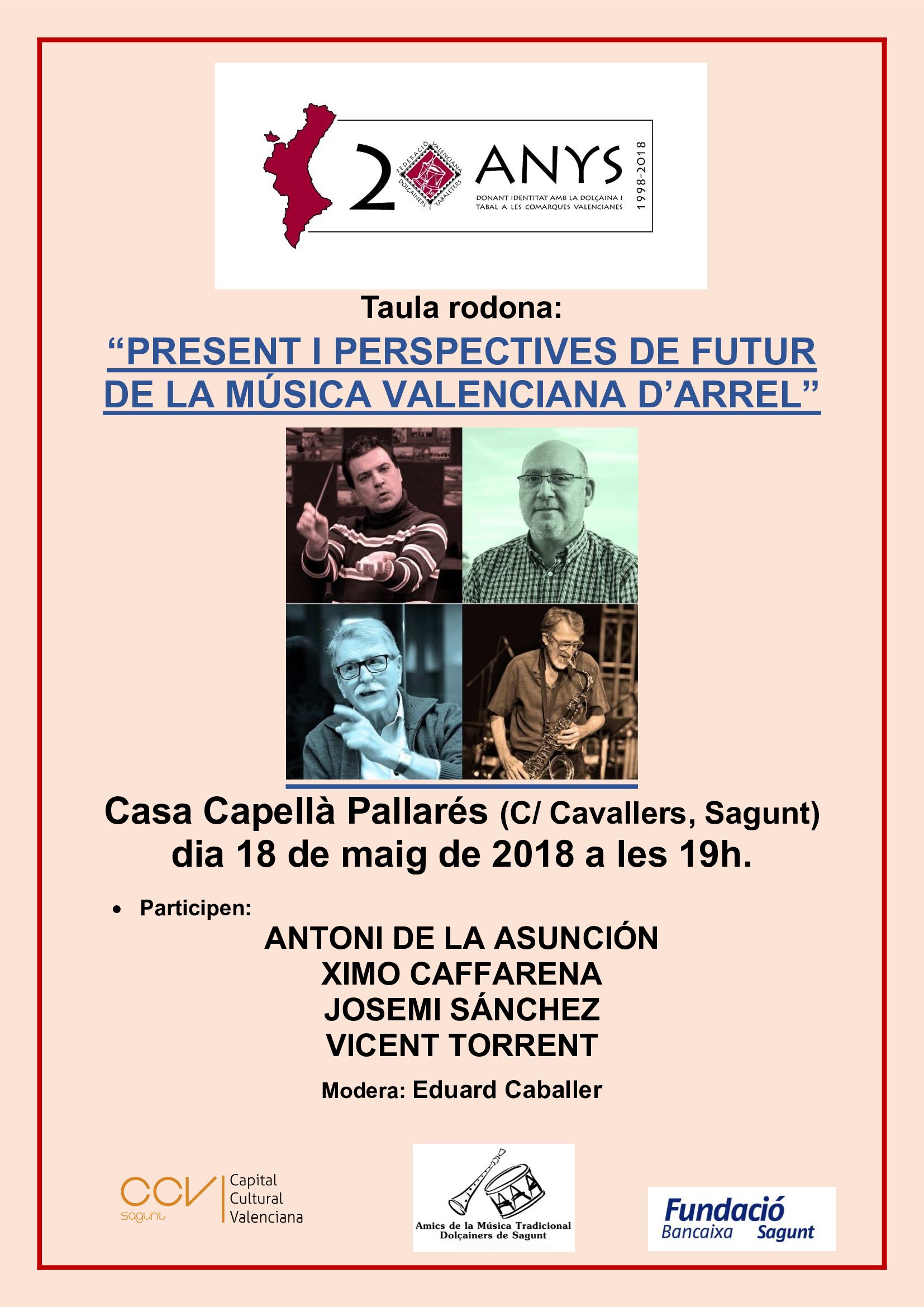 Entre los actos más relevantes, destaca la mesa redonda que tendrá lugar el viernes, 18 de mayo, a las 19 horas en la Casa Capellà Pallarés sobre el “Presente y perspectivas de futuro de la música valenciana de raíz”, en la que participarán Antoni de la Asunción, Ximo Caffarena, Josemi Sánchez y Vicent Torrent y moderará Eduard Caballer. Por otro lado, el sábado, 19 de mayo, durante todo el día tendrán lugar diferentes talleres sobre música tradicional en el Centro Cultural Mario Monreal a las 10 horas (Ritmos de tabal y dulzaina), en el CEIP Cronista Chabret a las 16 (Pandereta tradicional) y a las 17.30 horas (Baile folk y tradicional), así como una charla-concierto de música tradicional valenciana a las 12 horas en el patio del Mercado de Sagunto.