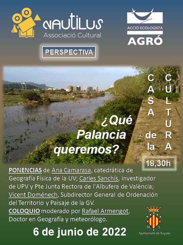 En esta ocasión, la Asociación Cultural Nautilus colabora con Acció Ecologista Agró-Morvedre para presentar un acto multidisciplinar conducido por Rafael Armengot, doctor en Geografía y meteorólogo, que arrancará con la proyección del audiovisual El río Palancia en el Camp de Morvedre, realizado por Carlos González Torres, y a continuación se desarrollarán las tres ponencias a cargo de personalidades muy relevantes y especialistas en este tema: Ana Camarasa Belmonte, catedrática de Geografía Física de la Universitat de València, bajo el título ¿Qué río tenemos?; Carles Sanchis Ibor, investigador de la Universidad Politécnica de Valencia y presidente de la Junta Rectora de la Albufera de València, que abordará la Gestión del agua y los sedimentos; y, finalmente, Vicent Doménech Gregori, subdirector general de Ordenación del Territorio y Paisaje de la Generalitat Valenciana, cuya intervención versará sobre La gestión de las riberas.