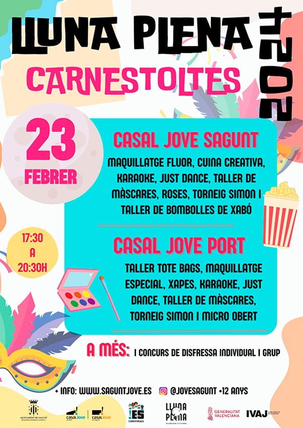 La concejalía de Juventud e Infancia del Ayuntamiento de Sagunto ha organizado una nueva actividad dentro del programa Lluna Plena. En esta ocasión dedicada al carnaval bajo el nombre ‘Lluna Plena Carnestoltes’. La actividad se desarrollará en los Casales Jóvenes de Sagunto y Puerto de Sagunto el viernes 23 de febrero de 17.30 a 20.30 horas. Está destinada a personas de más de 12 años.