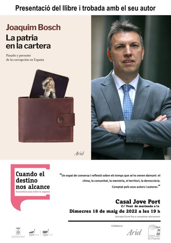 El juez Joaquim Bosch será el protagonista de la segunda cita del ciclo Cuando el destino nos alcance: encuentros para evitar la ceguera, que organiza el Departamento de Juventud e Infancia del Ayuntamiento de Sagunto, en el que el magistrado del Juzgado de Primera Instancia e Instrucción Nº 1 de Moncada presentará su último libro: La patria en la cartera. Pasado y presente de la corrupción en España.