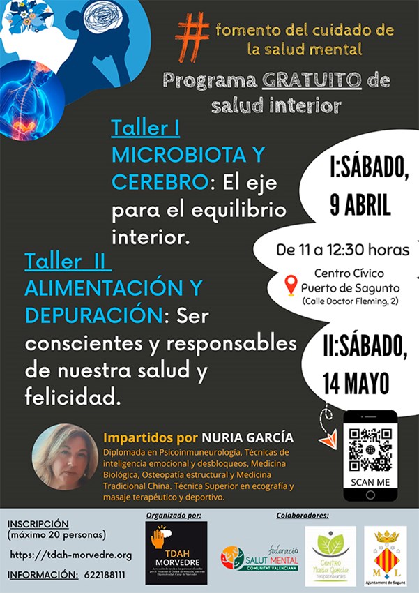 La encargada de impartir los talleres, Nuria García, es diplomada en Psicoinmuneurología, Fisioterapeuta, en Medicina Biológica, en Osteopatía Estructural y en Hipnosis Clínica, entre otros. Además, cuenta con una experiencia de más de 15 años cooperando con otros profesionales e impartiendo cursos y talleres de mindfulness, meditación y conciliación en asociaciones de dolor crónico. Por otra parte, es asociada de TDAH Morvedre y conoce de primera mano la situación de las personas con este trastorno.