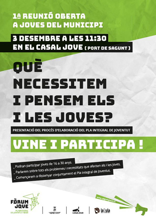 La concejalía de Juventud del Ayuntamiento de Sagunto pone en marcha “Què necessitem i pensem els i les joves?”. Se trata de la primera reunión abierta para jóvenes del municipio, que tendrá lugar el próximo sábado 3 de diciembre, a las 11:30 en el Casal Jove de Puerto de Sagunto.