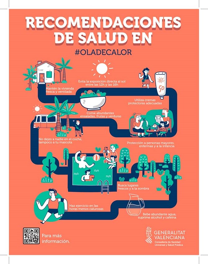 La concejalía de Sanidad del Ayuntamiento de Sagunto aconseja a la ciudadanía para cuidarse ante la ola de calor que vive actualmente el país. Aunque en la zona de Sagunto por el momento no hay un riesgo alto, se ofrecen algunas pautas a seguir para prevenir posibles golpes de calor u otras incidencias a causa de las altas temperaturas.