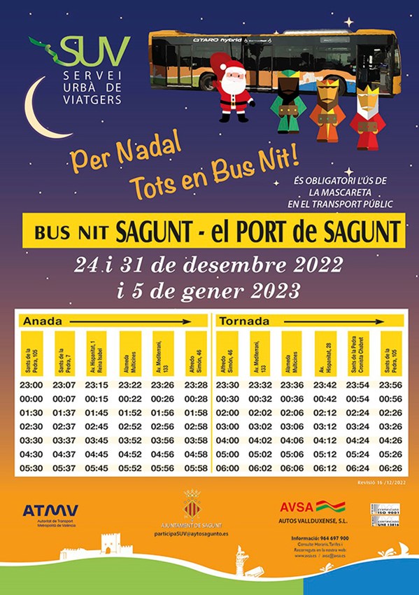 El Ayuntamiento de Sagunto, en colaboración con Autos Vallduxense SL y la Autoridad de Transporte Metropolitano de Valencia, reforzará el servicio de autobús nocturno para estas navidades, prolongando el horario una hora y añadiendo la noche de Reyes a los días de Nochebuena y Nochevieja, que este año caen en sábado.