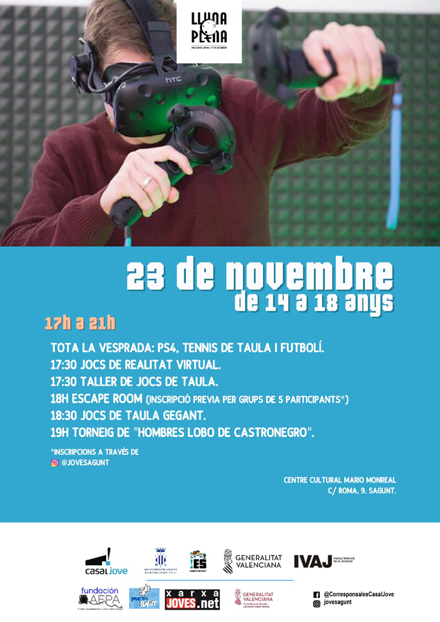 La programación de ocio alternativo que lleva a cabo la concejalía de Juventud a través del programa Luna Llena continúa este viernes con actividades de juegos y talleres que se celebrarán en el centro Mario Monreal (Sagunto) desde las 17 horas hasta las 21 horas