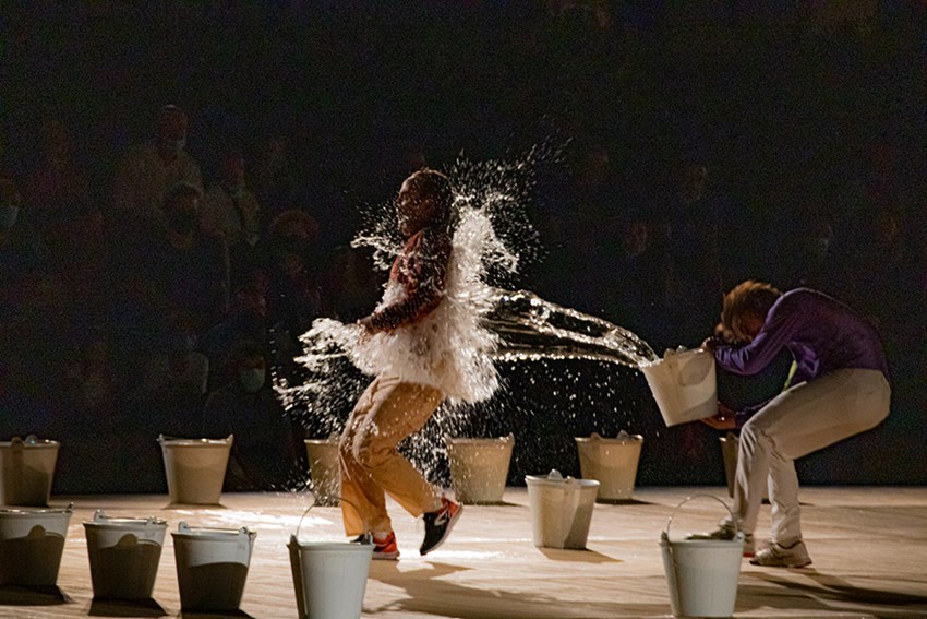 Los dos protagonistas de Water Falls, interpretados por Pau Bachero y Joan Vila, desencadenan una serie de situaciones desastrosas en las que el público se ve involucrado. A medida que la situación es más disparatada, los cubos y el agua multiplican el caos y las risas. Con los objetos crean una puesta en escena tanto dinámica como original.