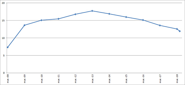 Evolución de la tasa de desempleo de Sagunto desde 2008 hasta 2018Los datos anuales por sectores productivos confirman la tendencia a la baja, sobretodo en la construcción que baja un 16’16% con respecto al mes de mayo de 2018. El sector servicios y el de la industria disminuyen la tasa de desempleados en un 7’84% y un 4’75% respectivamente comparándolo con el mismo mes de 2017. En cambio la tasa de variación respecto de mayo de 2017 en la agricultura ha aumentado en un 0’99%.