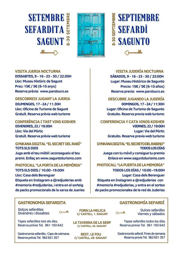La concejalía de Turismo del Ayuntamiento de Sagunto, en colaboración con la Red de Juderías de España, ha preparado un amplio programa de actividades como juegos, gastronomía y visitas guiadas a la Judería que se desarrollará del 8 al 30 de septiembre con motivo del 3 de septiembre, fecha en la que se celebran las Jornadas Europeas de la Cultura Judía.