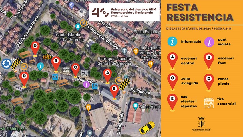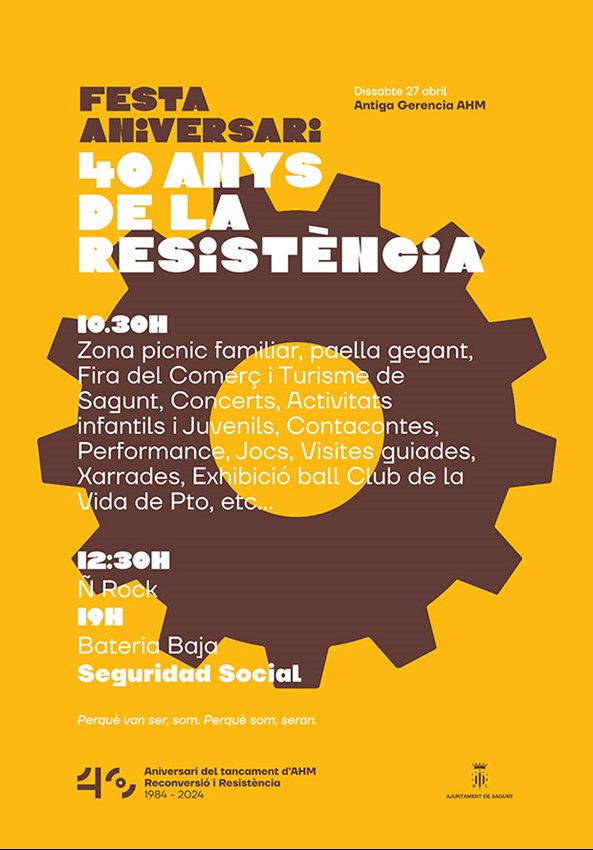 Este año se conmemora el 40 aniversario del cierre de AHM, un hecho histórico enmarcado en un contexto internacional, europeo y nacional con tremendas repercusiones no solo económicas sino también en el ámbito personal y comunitario. La fiesta, que está organizada por diversos departamentos del Ayuntamiento de Sagunto en colaboración con asociaciones y entidades, se realizará el próximo sábado 27 de abril en la zona de la Antigua Gerencia de AHM, concretamente en la avenida Adolfo Suárez, junto a los jardines de la Gerencia y el Museo Industrial y la Alameda.