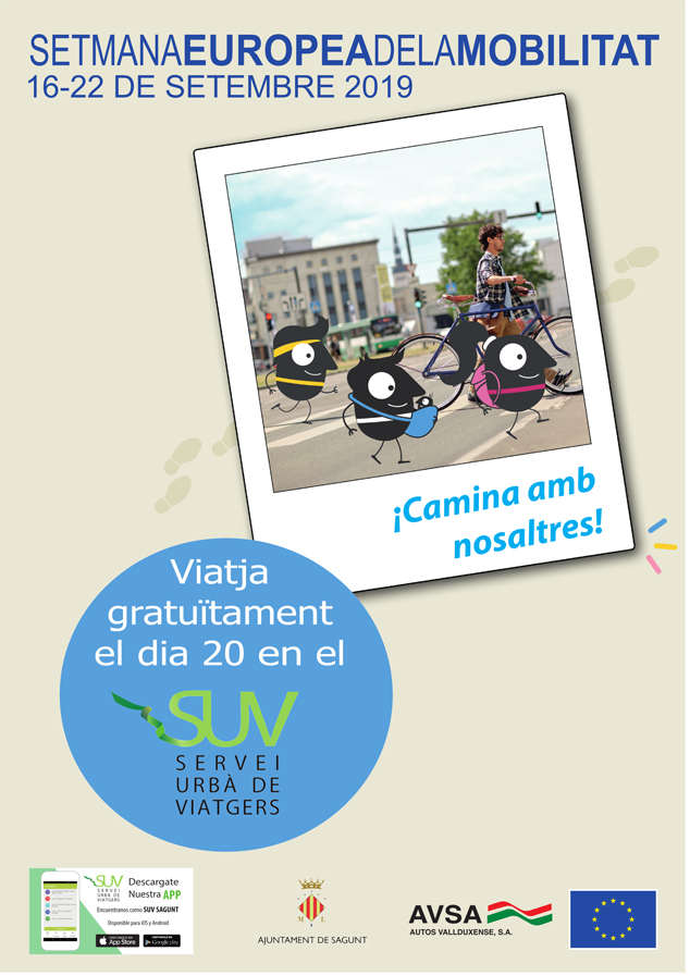 Un año más, Sagunto se suma a la celebración de la Semana Europea de la Movilidad, este año con actividades que tendrán lugar del lunes 16 al domingo 12 de septiembre. El Ayuntamiento de Sagunto, a través de la delegación de Movilidad Urbana, con la Federación Vecinal de Sagunto, organizará diferentes actividades alrededor de la movilidad urbana con la colaboración de la Fundación Bancaja Sagunto, de la Asociación Cultural Nautilus y de la empresa AVSA, así como del Movimiento MOUV 18 que engloba a la Federación Vecinal Sagunto, Discamp, Avocam, UDP, ADMPI, Yayo Flautas, Amigos de la Guitarra y Mujeres de Baladre.