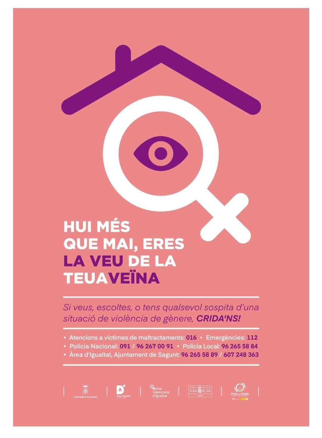 Además, desde el Área de Igualdad recuerdan que, si alguna mujer se encuentra en una situación de emergencia grave, puede llamar al Centro Coordinador de Emergencias 112. Si ha sido víctima de una agresión y necesita protección, puede llamar a la Policía Nacional 091 o 96 267 00 91; a la Policía Local 092 o 96 265 54 84; o a la Guardia Civil al 062.