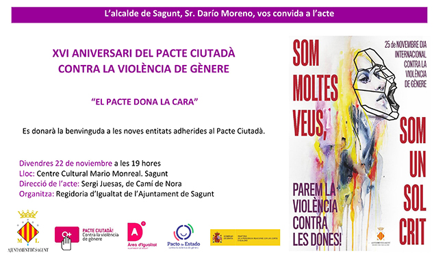 El Ayuntamiento de Sagunto, desde su Área de Igualdad, convoca a la ciudadanía a la conmemoración del 16º Pacto Ciudadano contra la Violencia de Género. El acto tendrá lugar el próximo viernes 22 de noviembre, a partir de las 19.00 horas, en el Centro Cultural Mario Monreal de Sagunto.