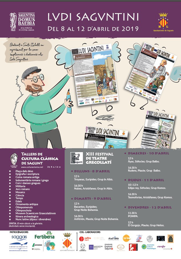 Los Ludi Saguntini, como cada primavera, inundan la ciudad de Sagunto de cultura clásica, empezando por los talleres que se ofertan y que tendrán lugar en la Domus Baebia. Entre la oferta se encuentran talleres de epigrafía y escritura, de cocina romana antigua, de indumentaria romana y griega, de juegos romanos, de mosaicos, etc., así como visitas a la Plaça dels Déus o al Museo de la Escena Grecolatina. Como novedad, este año se incluye un taller de realidad virtual realizado por el Cefire. La asistencia a los talleres se espera que sea de más de 7.000 alumnos y alumnas que hay inscritos y que también acudirán al teatro Olimposkola, que tendrá lugar en el Centro Cultural Mario Monreal.